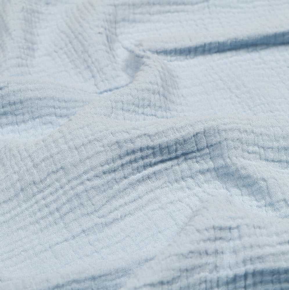 Repassage doux (ne pas écraser le tissu avec le fer). La double gaze a un aspect froissé donc il n'est pas utile de la repasser, à part si elle comporte des plis par exemple après avoir été pliée longtemps ou si elle a été étendue sur un fil.